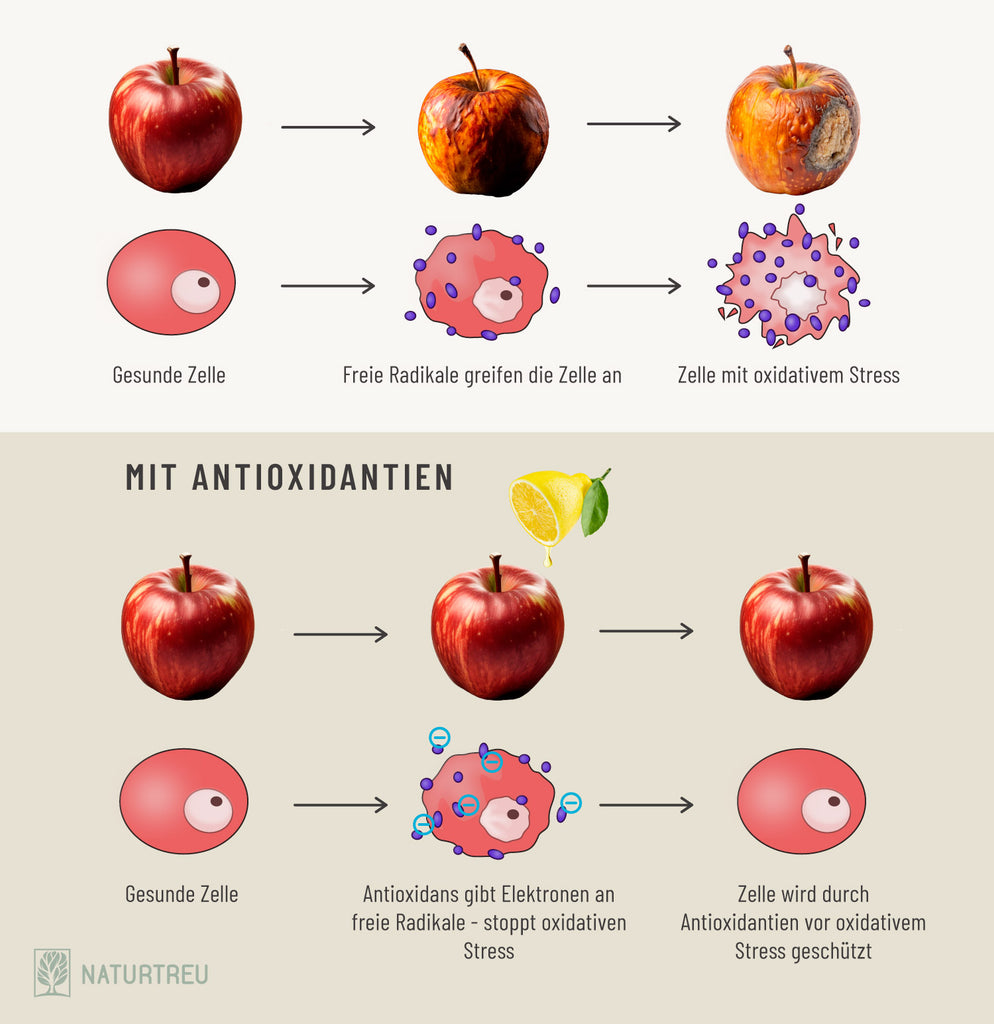 Mit natürlichen Antioxidantien, einer Ernährung voller bunter Pflanzenstoffe, ausreichend Schlaf und einem achtsamen Lebensstil kannst du deinen Körper dabei unterstützen, dieses Gleichgewicht besser zu halten⁶.