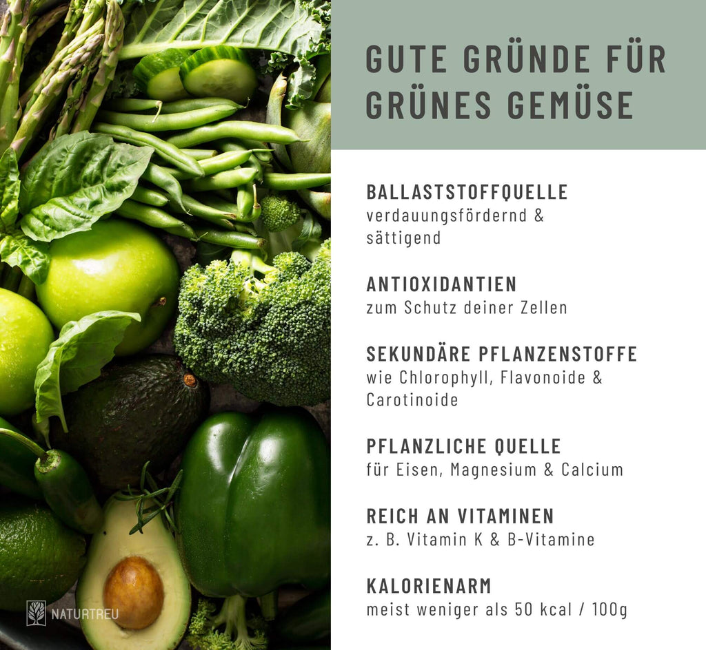Das grüne Superfood-Pulver von NATURTREU bietet alles, was ein hochwertiges Gemüsepulver ausmacht: Es setzt auf 37 hochwertige Inhaltsstoffe, ist kalorienarm und kommt ganz ohne Haushaltszucker, Süßstoffe oder unnötige Füllstoffe aus. Für uns ist es selbstverständlich, auf künstliche Aromen und Gentechnik zu verzichten. Außerdem garantiert ein TÜV-geprüfter Laborbericht, dass unser Greens-Pulver frei von Schwermetallrückständen ist.