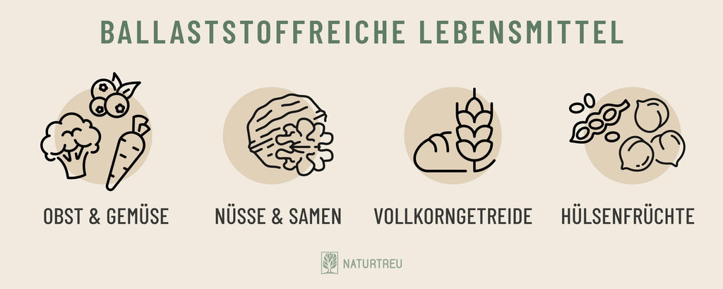 Ballaststoffreiche Lebensmittel | Haferflocken, Flohsamenschalen, geschrotete Leinsamen, Äpfel, Beeren, Bananen, Karotten, Süßkartoffeln, Hülsenfrüchte, Zitrusfrüchten, Artischocken, Chicorée und Schwarzwurzel4 | Vollkornprodukte, Weizenkleie, Nüsse und Samen, grünes Blattgemüse, Kohl, Brokkoli, Blumenkohl, Schalen von Obst und Gemüse (z. B. Apfel- oder Gurkenschale)4 |