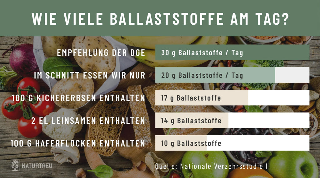 Die Ergebnisse der Nationalen Verzehrsstudie II zeigen, dass drei Viertel der Erwachsenen diesen Richtwert nicht erreichen. Im Schnitt nehmen Frauen 18 Gramm und Männer 19 Gramm Ballaststoffe pro Tag zu sich²².