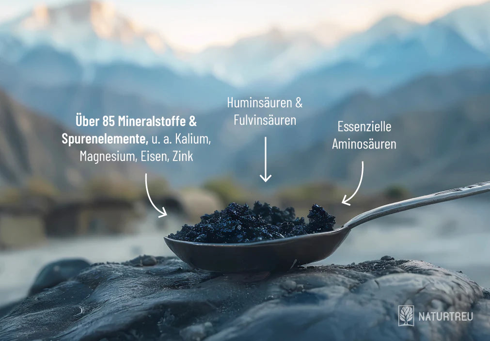 Werfen wir einmal einen Blick auf die Inhaltsstoffe von Shilajit, sticht vor allem die große Anzahl an essenziellen Mineralstoffen und Spurenelementen, wie Kalium, Magnesium, Eisen, Zink und Mangan, hervor.¹ Außerdem ist das harzartige Naturprodukt reich an diversen Aminosäuren, Humin- und Fulvinsäuren sowie weiteren organischen Verbindungen.¹