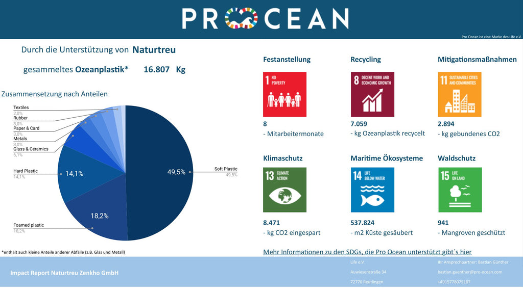 Während Naturtreu als Unternehmen durch nachhaltige Verpackungen und Transparenz Verantwortung übernimmt und fortwährend an neuen Maßnahmen zum Klimaschutz arbeitet, konzentriert sich Pro Ocean auf den Schutz der Natur durch den Kampf gegen Ozeanplastik.