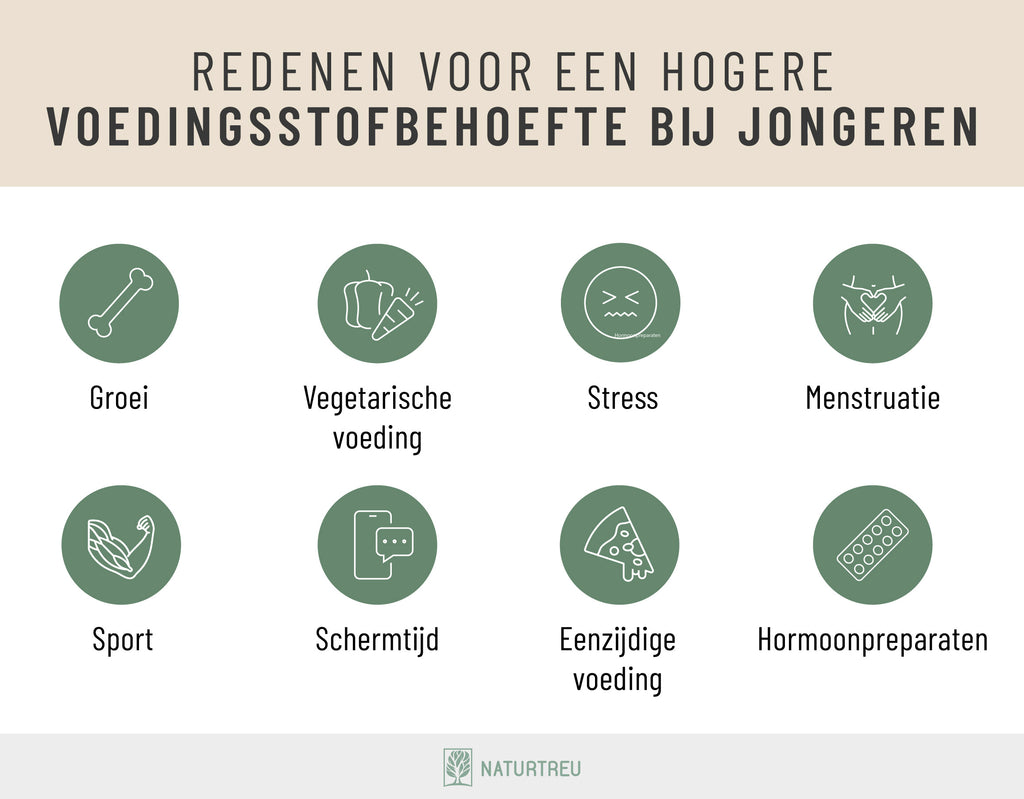 Hinzu kommen Phasen des schnellen Wachstums, in denen der Körper schlichtweg mehr Nährstoffe braucht. Auch in Zeiten intensiver körperlicher oder geistiger Belastung, zum Beispiel vor Prüfungen oder bei viel Sport, haben Jugendliche unter Umständen einen höheren Nährstoffbedarf³⁷.