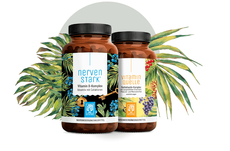 Wenn du auf der Suche nach einem hochwertigen Vitamin B-Komplex bist, ist NERVENSTARK genau das richtige für dich. Der Komplex vereint alle 8 B-Vitamine, größtenteils in ihrer aktiven Form. Ergänzt werden sie um die Cofaktoren Cholin, Betain und Myo-Inositol. Daraus ergeben sich wertvolle Synergie-Effekte, um Energie¹, Nerven², Psyche³, das Immunsystem⁴ und viele weitere Funktionen optimal zu unterstützen.