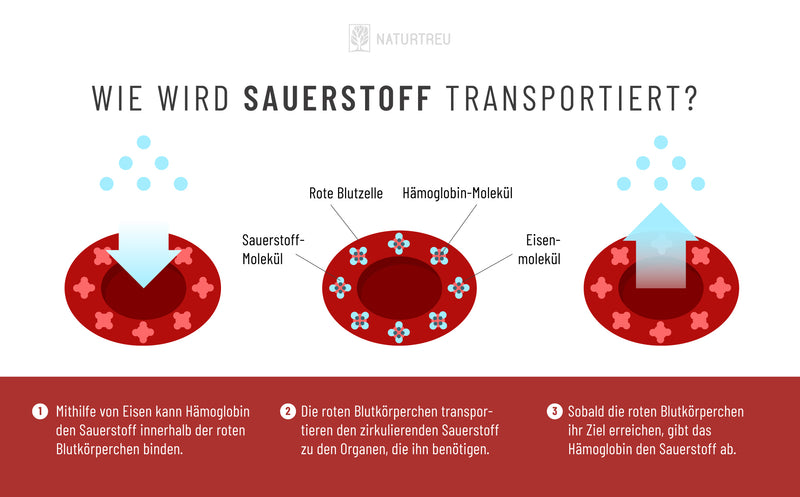 Zur Bildung der roten Blutkörperchen wird der Blutfarbstoff Hämoglobin² benötigt, welches zu einem großen Teil aus Eisen besteht. Nur, wenn genügend Hämoglobin – und damit natürlich auch Eisen – vorhanden ist, kann der Sauerstofftransport optimal funktionieren¹.