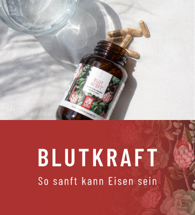 Falls es dir schwerfällt, zu wenig eisenreiche Lebensmittel in deinen Alltag zu integrieren, könnte BLUTKRAFT ein wertvoller Begleiter für dich sein: Unser ausgeklügelter Eisen-Komplex mit Fenchel und Vitamin C trägt dazu bei, dich mit dem essenziellen Spurenelement zu versorgen.