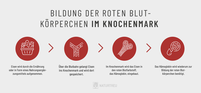 Dieser Prozess findet im Knochenmark statt: Hier wird das Eisen in den roten Blutfarbstoff, das Hämoglobin, eingebaut. Wenn nicht genügend Eisen vorhanden ist, können nicht genug Hämoglobin und infolgedessen auch nicht mehr genug rote Blutkörperchen gebildet werden²⁴.