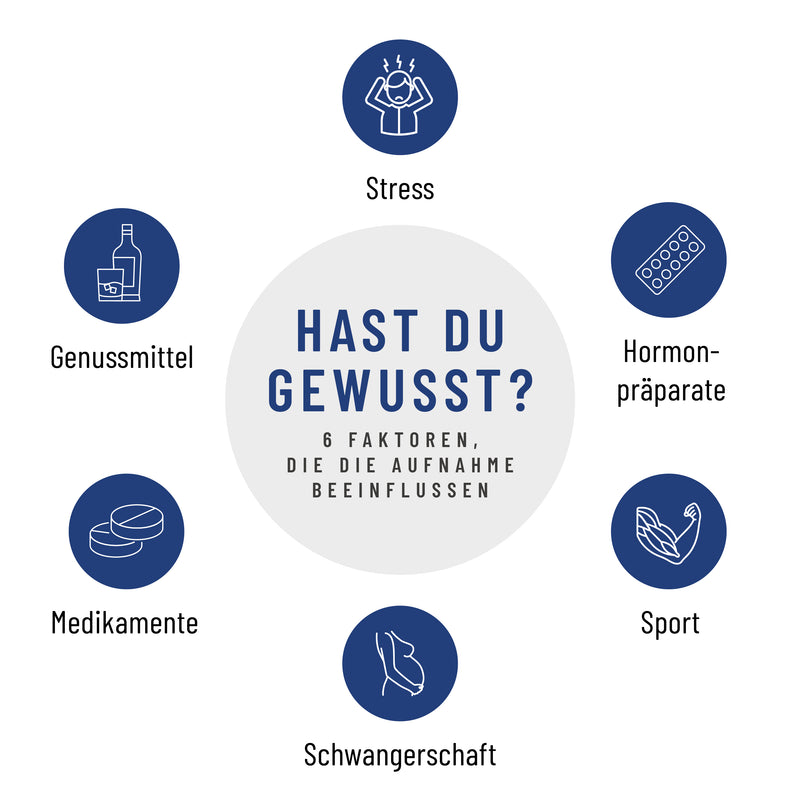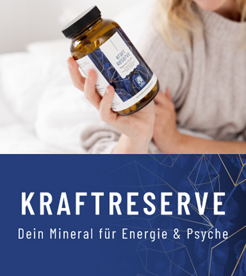 Auch Stress¹⁴, der Genuss von Alkohol¹⁵ oder die Einnahme von Hormonpräparaten¹⁶, können die Magnesiumaufnahme hemmen. Umso wichtiger ist es, die tägliche Zufuhr des so wichtigen Mineralstoffs im Auge zu behalten. Genau dafür wurde unser KRAFTRESERVE Komplex entwickelt. Mit einer Tagesdosis von nur 2 Kapseln werden dem Körper unglaubliche 400 mg elementares Magnesium zur Verfügung gestellt. Bei einem Inhalt von insgesamt 180 Kapseln ist damit eine ausgewogene Zufuhr über ganze 3 Monate gesichert.