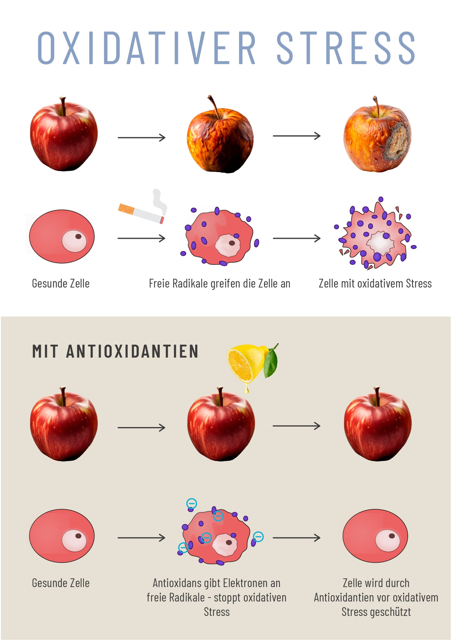 Freie Radikale sind instabile und aggressive Moleküle, denen ein Elektron fehlt. Um wieder „stabil“ zu werden, versuchen sie, das fehlende Elektron aus anderen Zellen zu entreißen.