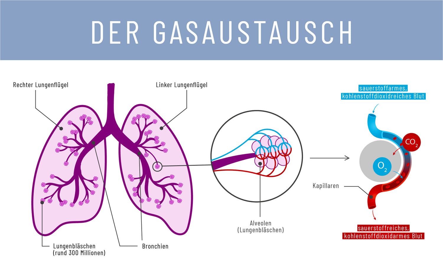 Unsere Lunge ist ein wahres Wunderwerk: Sie ist dafür verantwortlich, den Sauerstoff aus der Atemluft aufzunehmen und an den Körper weiterzugeben – und gleichzeitig verbrauchte Luft in Form von Kohlendioxid abzugeben⁴.