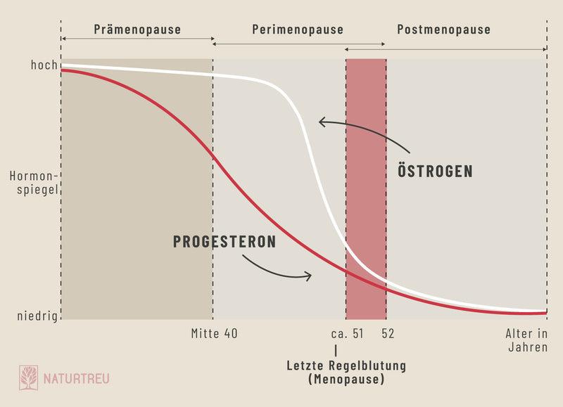 Ein zentraler Faktor für die Entstehung von Wechseljahresbeschwerden ist das frühere Absinken des Progesteronspiegels im Vergleich zu Östrogen. Im Gegensatz dazu bleibt der Östrogenspiegel zunächst stabil, auch wenn das Hormon im Laufe der Zeit ebenfalls abnimmt⁷. Dieses Ungleichgewicht zwischen diesen beiden Hormonen – weniger Progesteron bei noch vorhandenem Östrogen – kann die typischen Beschwerden verursachen⁸. Erst später sinkt auch der Östrogenspiegel deutlich ab, was die Wechseljahressymptome weiter verstärken kann⁹.