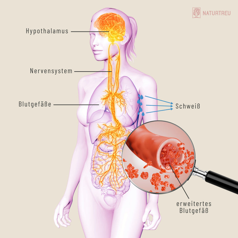 Durch das Abfallen der Hormone in den Wechseljahren wird diese Thermoregulation im Hypothalamus gestört – das Gehirn “denkt”, es sei zu warm und der Körper müsse sich dringend abkühlen, obwohl der Körper gar nicht überhitzt ist¹⁴.