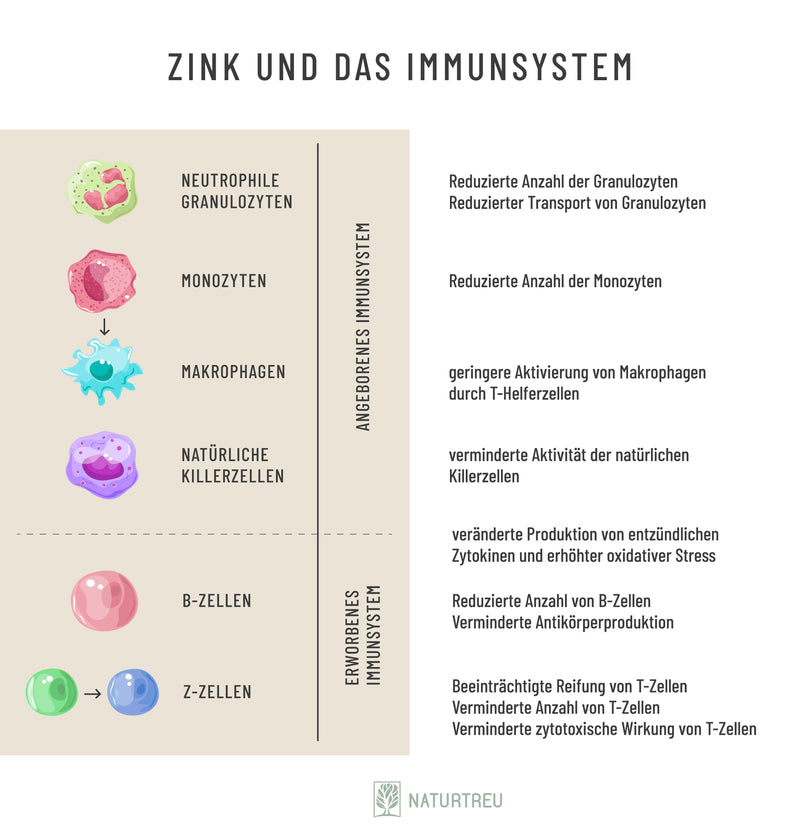 Zusätzlich unterstützen B-Lymphozyten und T-Lymphozyten dabei, zukünftig auf neue Herausforderungen des Immunsystems gewappnet zu sein.Was das mit unserem WUNDERVOLL zu tun hat? Ein Mangel an Zink kann dazu führen, dass die einzelnen Zellen nicht optimal funktionieren.