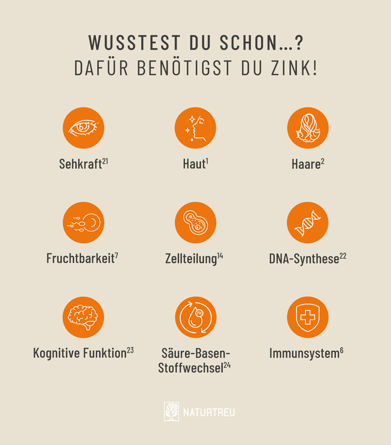 Die Beteiligung an unzähligen biochemischen Prozessen im Körper sorgt dafür, dass das Zink in unserem WUNDERVOLL auch wesentlicher Bestandteil deines Stoffwechsels⁴ ⁵ ist – für Proteine, Kohlenhydrate und Fette¹⁶.