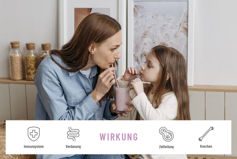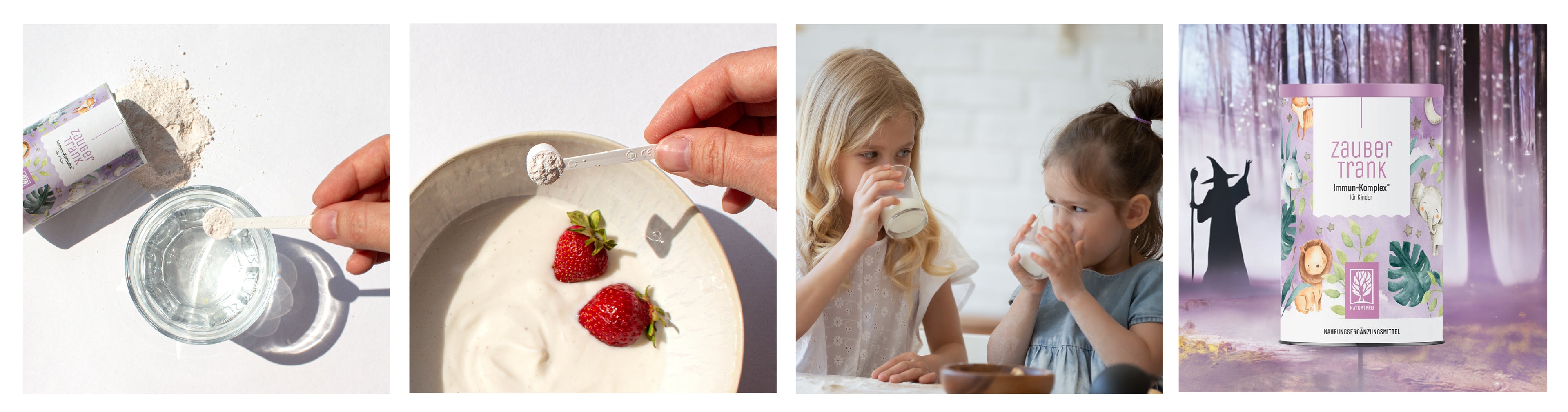 ZAUBERTRANK liefert eine Vielzahl von Mikronährstoffen, die zu einer normalen Entwicklung des kindlichen Organismus beitragen, angefangen beim Immunsystem⁴ über Knochen⁵ und Zähne⁶ bis hin zur kognitiven Funktion⁷. Das geschmacksneutrale Pulver enthält weder Süßungsmittel noch künstliche Aromastoffe und kann problemlos in die Lieblingsspeise oder das Lieblingsgetränk - vorzugsweise trübe Getränke - eingerührt werden.