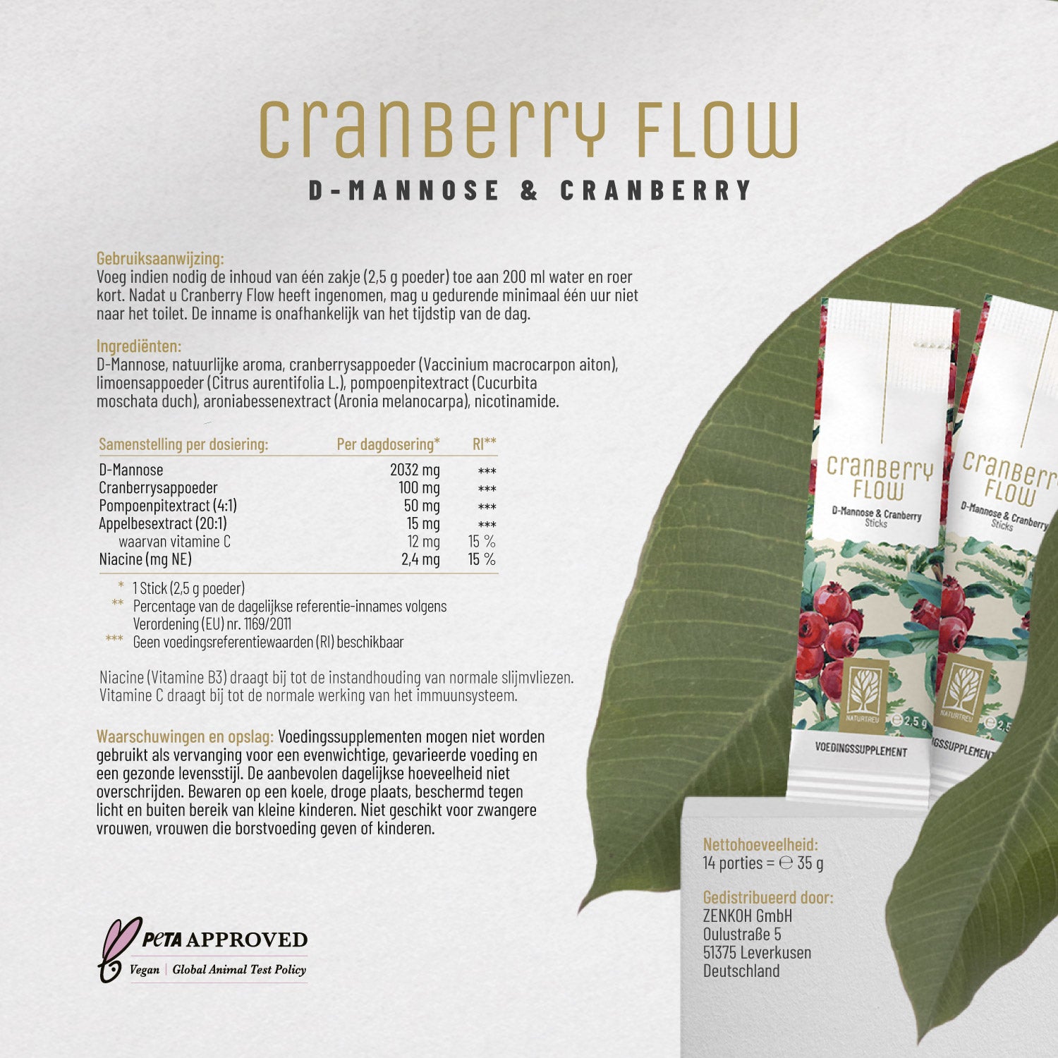 CRANBERRY FLOW is ons hoogwaardige drankpoeder dat D-mannose combineert met cranberry- en pompoenpitextract. De samenstelling wordt aangevuld met vitamine C en niacine (vitamine B3), die bijdragen aan het behoud van een normaal immuunsysteem² en normale slijmvliezen¹ – zoals het blaasslijmvlies.