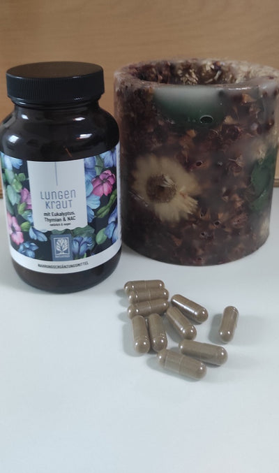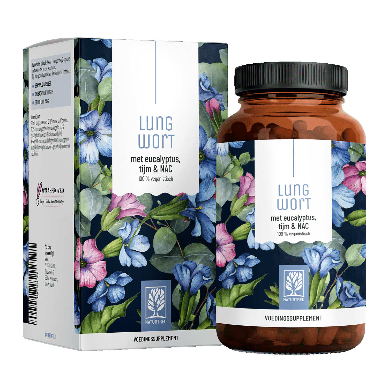 De productnaam LUNG WORT verwijst naar het belangrijkste bestanddeel van dit complex: gemalen longkruid. Deze plant is in kruidentuinen te vinden en staat al sinds de middeleeuwen bekend om haar nuttige eigenschappen. Hij werd in de 12e eeuw populair door de beroemde geleerde en natuurgeneeskundige Hildegard von Bingen. Sindsdien wordt het veelvuldig toegepast als ingrediënt in hoest- en bronchiale theeën en siropen⁶. Ons complex bevat behalve een hoog gedoseerd longkruidextract ook gemalen tijm en eucalyptusextract, twee plantaardige bestanddelen die in combinatie met longkruid synergetische effecten hebben en daarnaast N-acetyl-L-cysteïne en vitamine B2.
