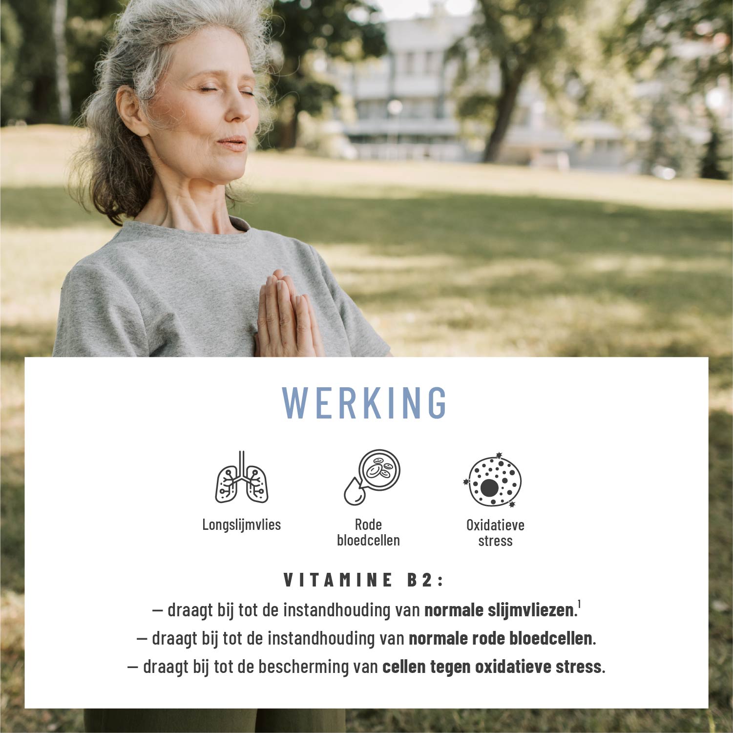 De toegevoegde N-acetyl-L-cysteïne (NAC) is een verbinding van azijnzuur en het aminozuur L-cysteïne, dat wordt beschouwd als een krachtige antioxidant⁷. Ook vitamine B2 ondersteunt de bescherming van cellen tegen de schadelijke effecten van oxidatieve stress ⁵.