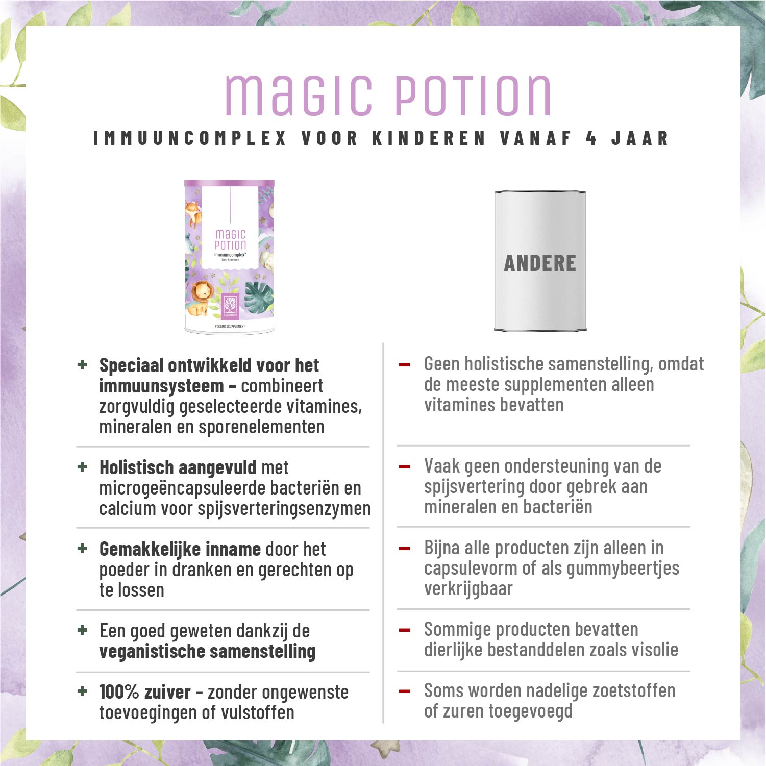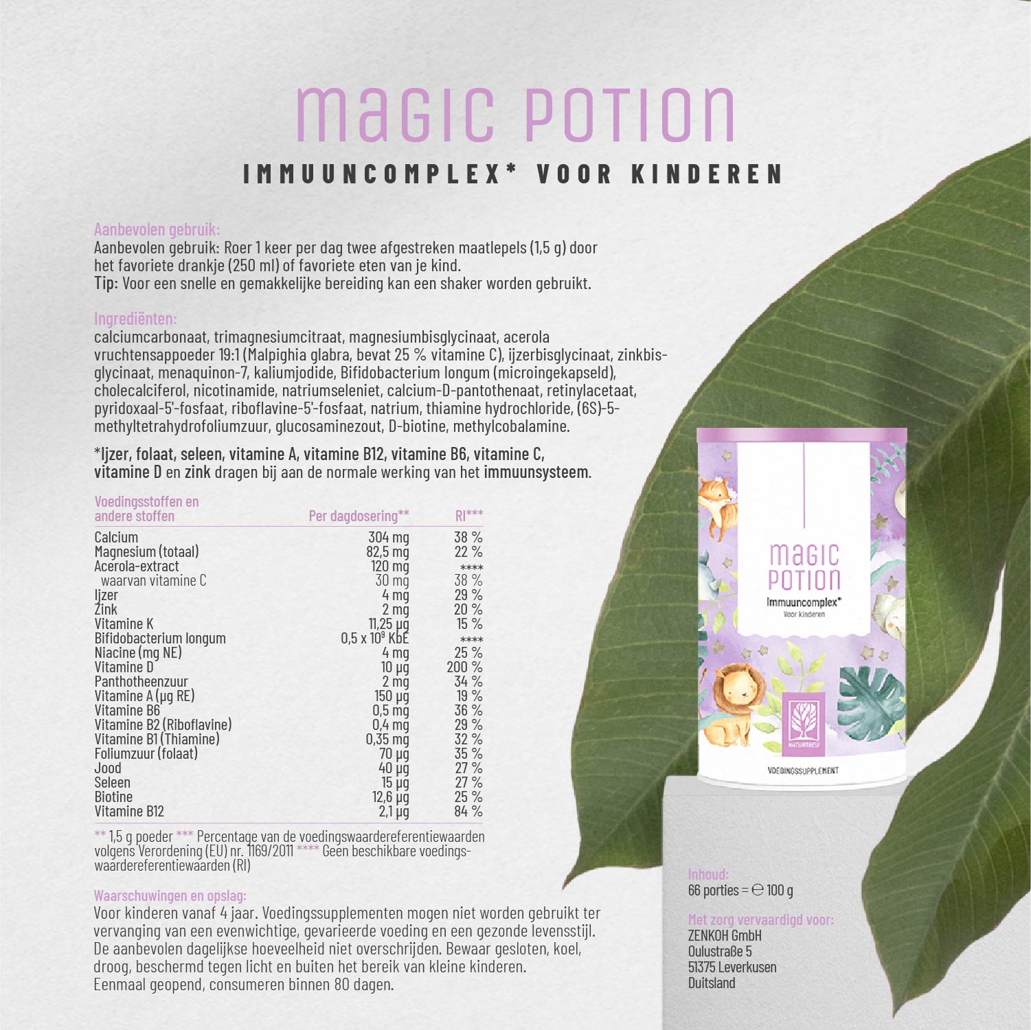 MAGIC POTION maakt het ouders gemakkelijk om hun kinderen extra micronutriënten te geven dankzij een uitgebalanceerde mix van 19 voortreffelijke ingrediënten.