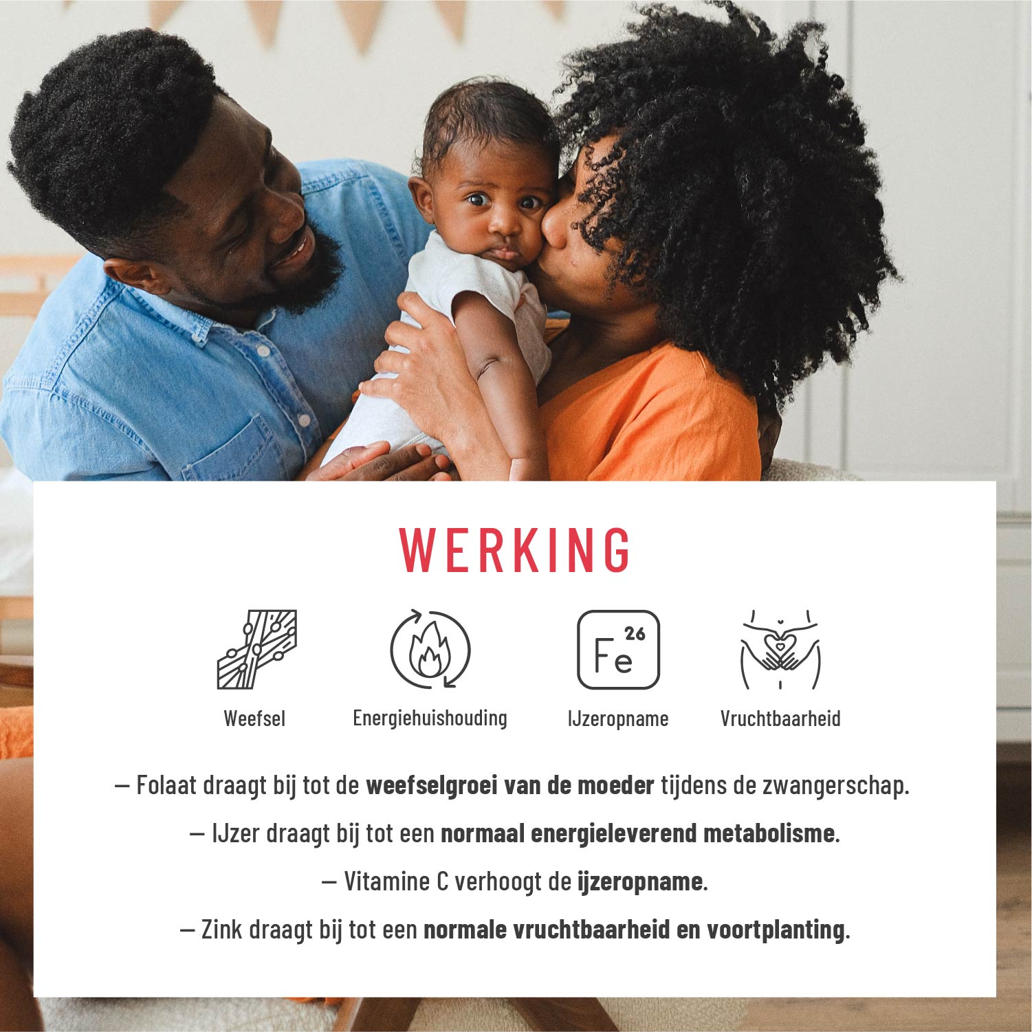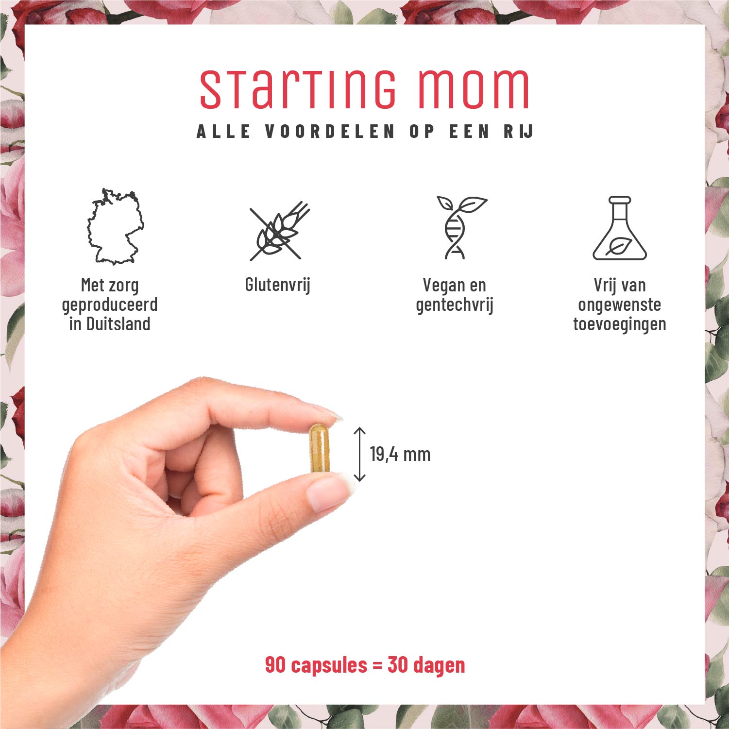 STARTING MOM levert per dagdosering 400 microgram foliumzuur – exact de hoeveelheid die vrouwen met een kinderwens dagelijks nodig hebben⁸. Daarnaast voorziet een dagelijkse dosis ook in de dagelijkse behoefte aan ijzer, vitamine C en zink.
