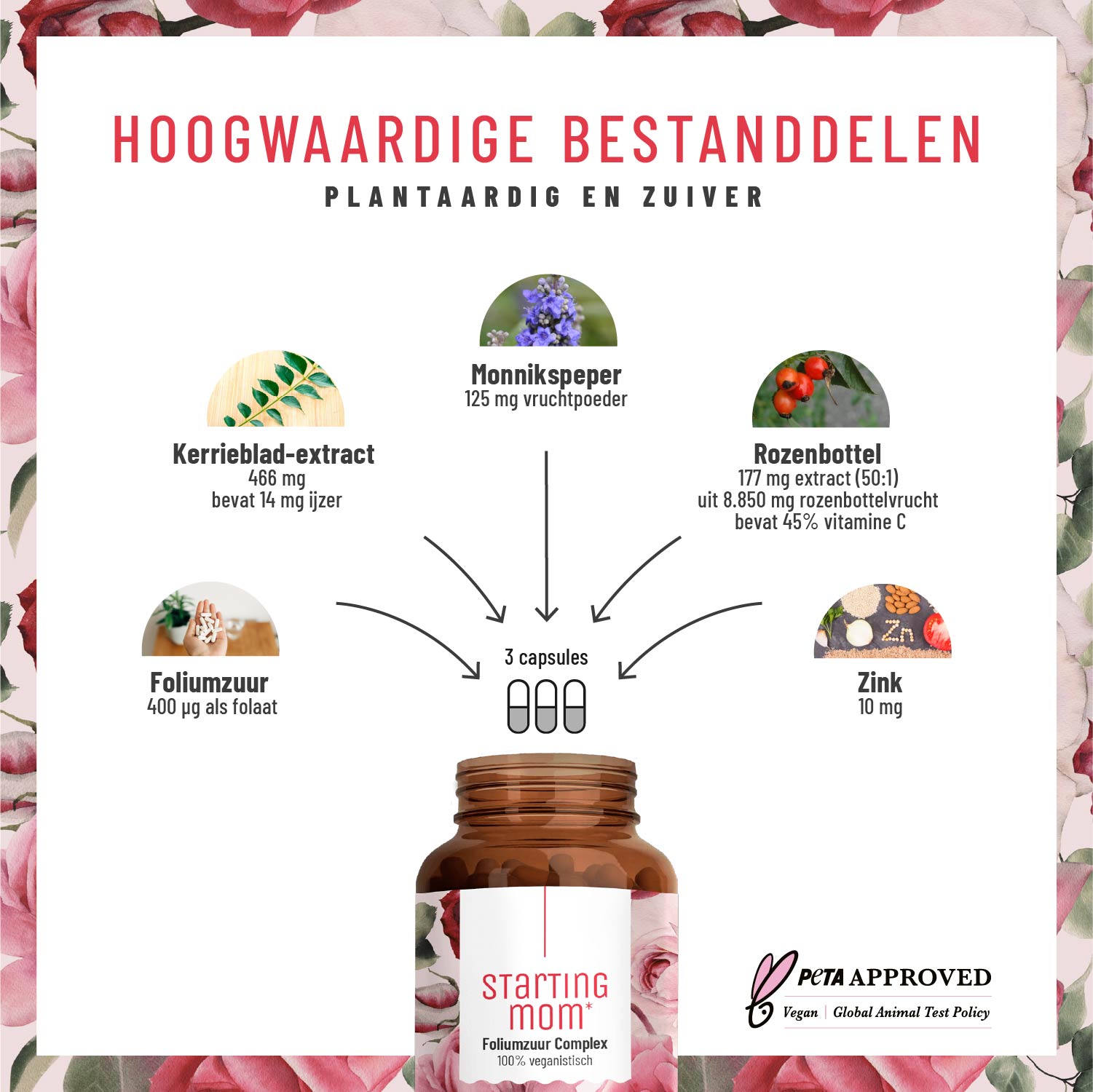 De belangrijkste plantaardige stoffen in STARTING MOM zijn de extracten van curryblad en rozenbottel. De eerste bevat het sporenelement ijzer, dat een functie heeft bij de celdeling⁵; De laatste bevat veel vitamine C, wat de ijzeropname bevordert⁶. Daarnaast bevat de formule van STARTING MOM ook poeder van de monnikspeper (Vitus agnus-castus). Dit is een plant die traditioneel wordt gebruikt in preparaten ter ondersteuning bij cyclusgerelateerde klachten⁷.