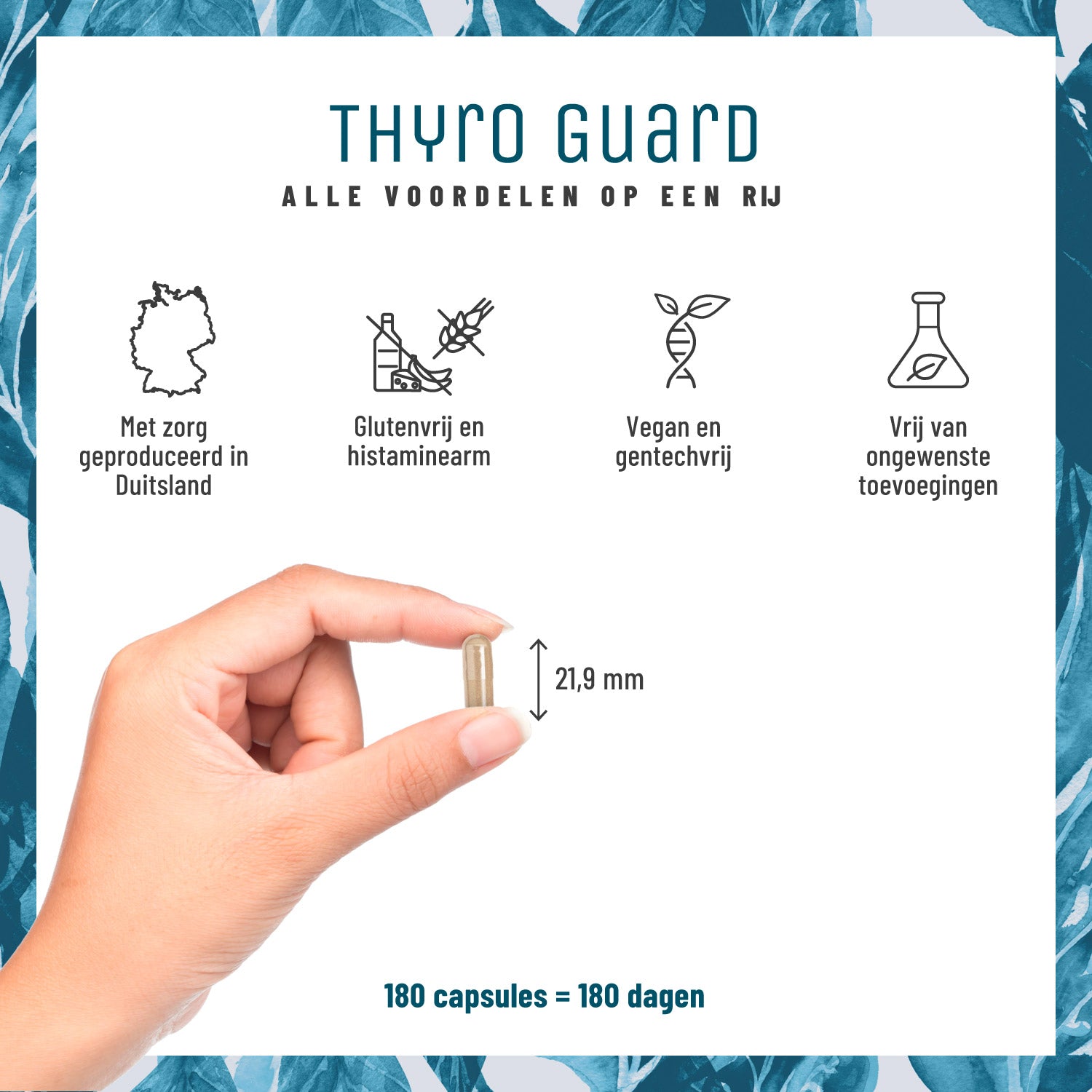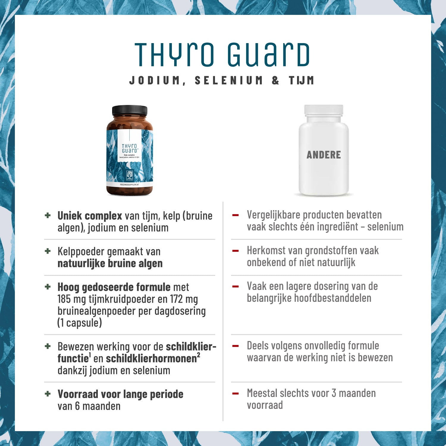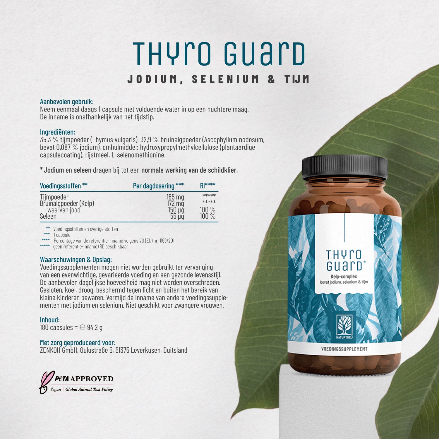 THYRO GUARD is ons geavanceerde kelpcomplex en is speciaal ontwikkeld ter ondersteuning van de schildklierfunctie¹'². Onze formule bevat 150 μg jodium, zorgvuldig gewonnen uit de bruine alg kelp, en 50 μg selenium. De formule wordt aangevuld met gemalen tijm. Bovendien gaat de inhoud bijzonder lang mee: één pot is voldoende voor maar liefst 180 dagen (6 maanden).