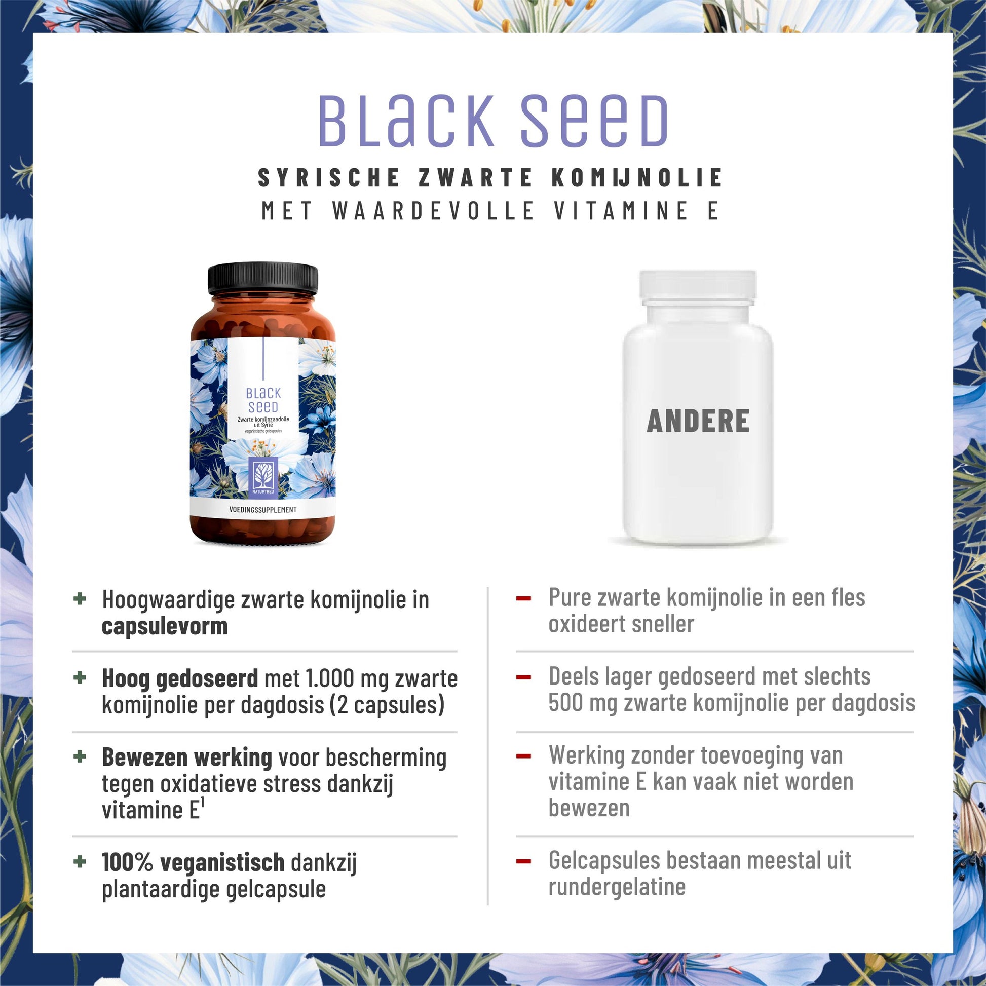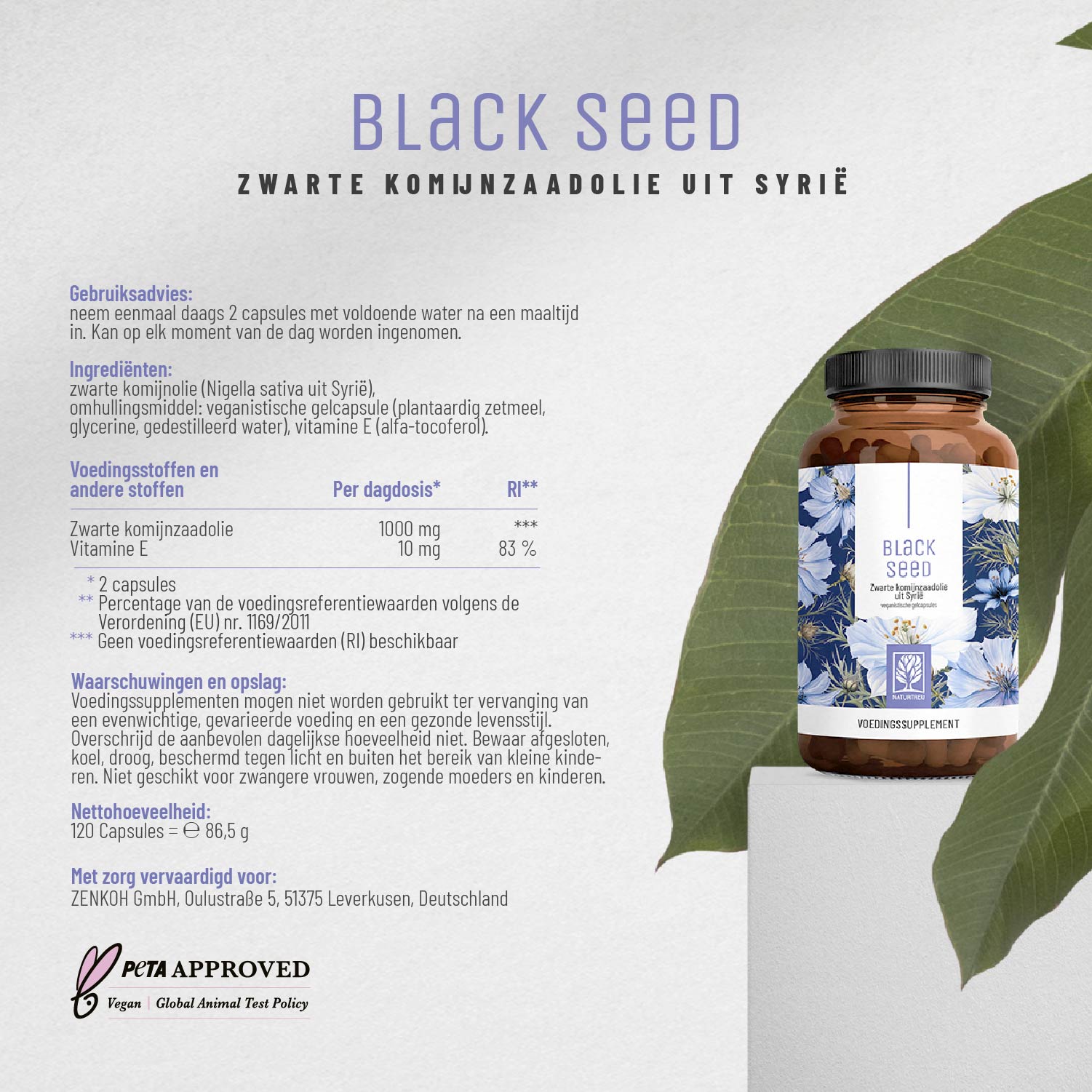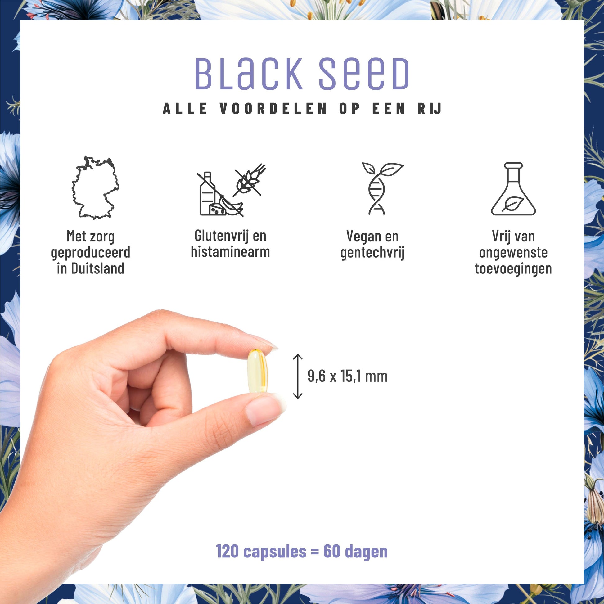 BLACK SEED dankt zijn naam aan de Syrische zwarte-komijnolie die het product bevat. Deze hoogwaardige olie is hoog gedoseerd met 1.000 mg per dagdosering (2 capsules) en zit in een gemakkelijk te slikken, 100% plantaardige gelcapsule – dit voorkomt oxidatie. BLACK SEED is bovendien verrijkt met waardevolle vitamine E, een krachtige antioxidant dat helpt de cellen te beschermen tegen oxidatieve stress¹.