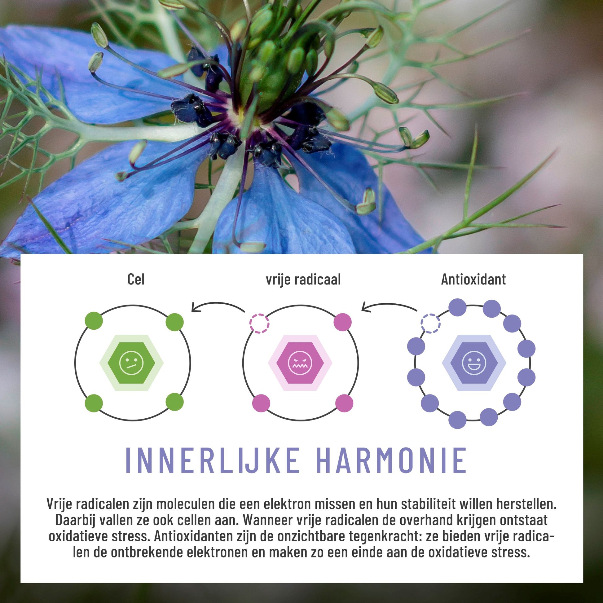 Antioxidanten maken vrije radicalen onschadelijk door een elektron af te staan zonder zelf gevaarlijk te worden³. Zie het als een brand blussen voordat die zich kan verspreiden.