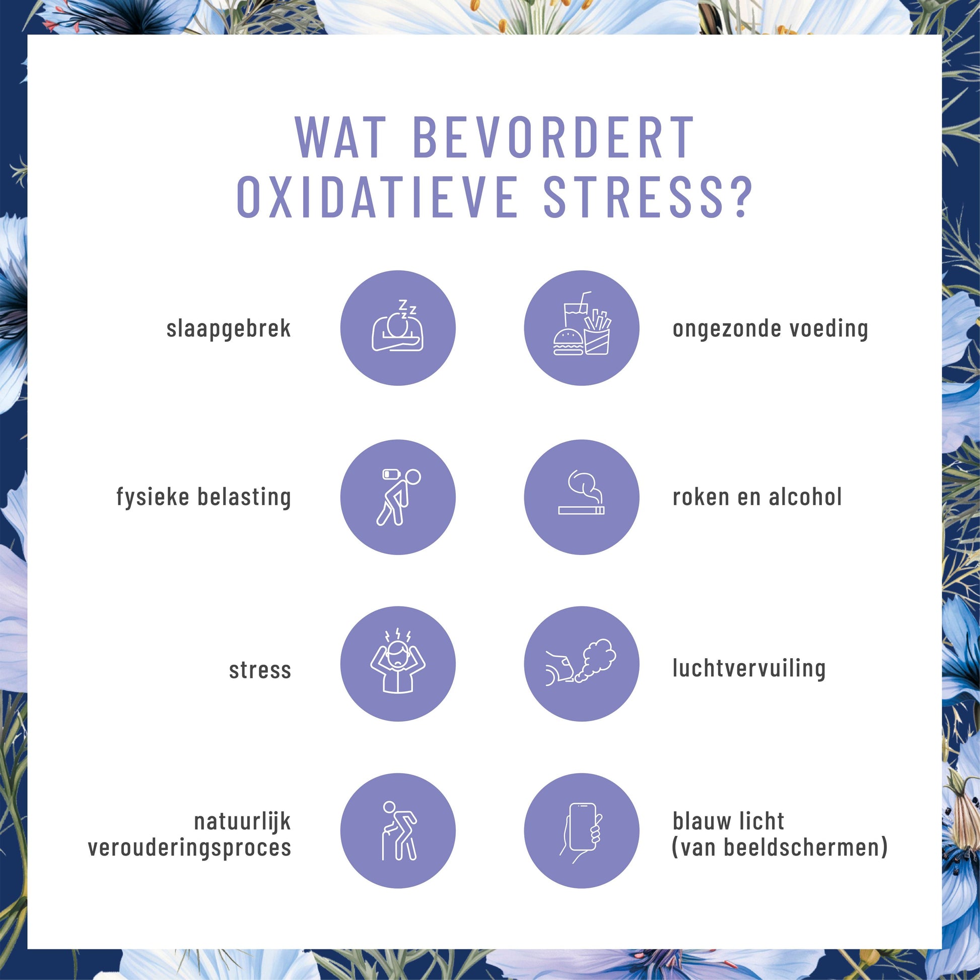 Problemen ontstaan wanneer er meer vrije radicalen zijn dan ons lichaam kan verwerken. Deze disbalans veroorzaakt oxidatieve stress: de instabiele deeltjes vallen cellen aan en kunnen op de lange termijn tot uiteenlopende gezondheidsproblemen leiden⁶.