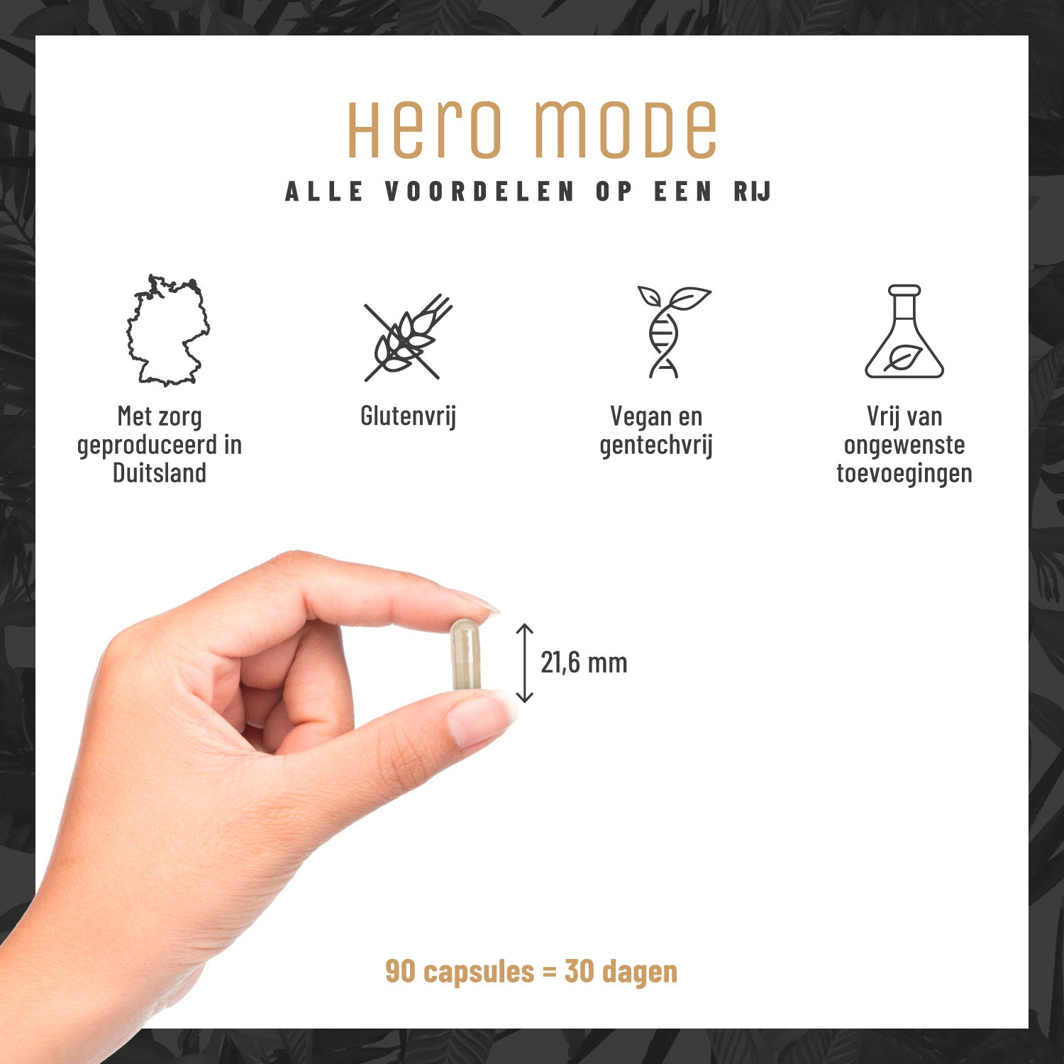 HERO MODE is speciaal ontwikkeld voor mannen die hun testosteronspiegel en vitaliteit op een natuurlijke manier willen ondersteunen naarmate ze ouder worden, ondanks de stress van het dagelijks leven.