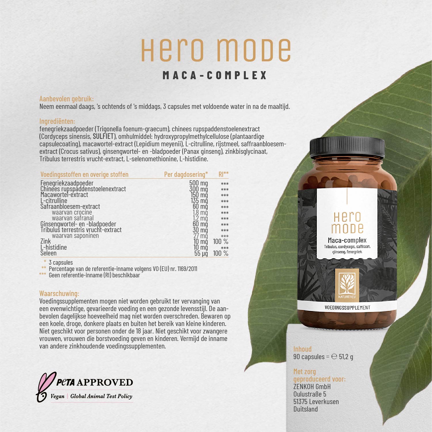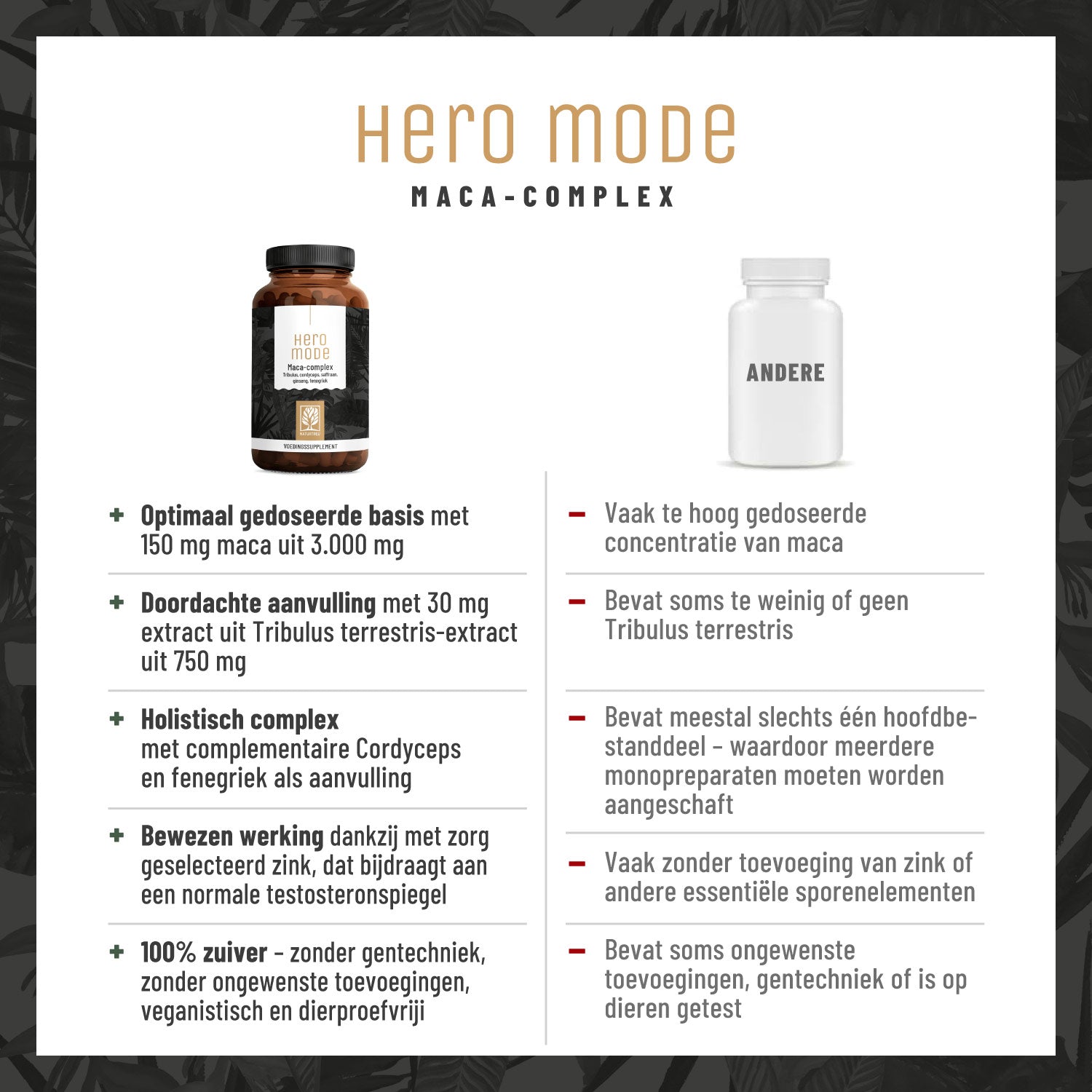 Een ander bijzonder kenmerk van HERO MODE is de hoge dosering maca. Het gebruikte 20:1-extract zorgt ervoor dat de dagdosering van 150 mg overeenkomt met 3.000 mg van de gemalen macaknol.