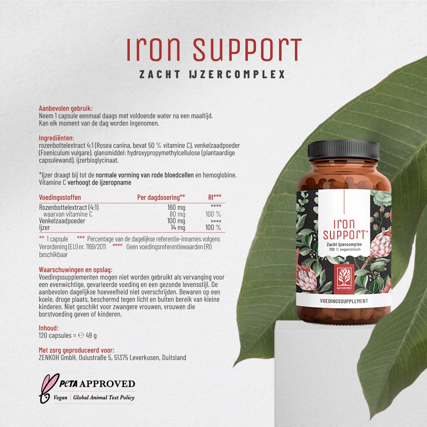 In tegenstelling tot de meeste ijzersupplementen wordt IRON SUPPORT niet als tablet, maar in capsulevorm aangeboden. Daardoor zijn pershulpmiddelen, doorgaans nodig bij tabletten, volledig overbodig. Door de hoge dosering van 14 mg ijzer per capsule (= 100% ADH⁶) heb je slechts één capsule per dag nodig.