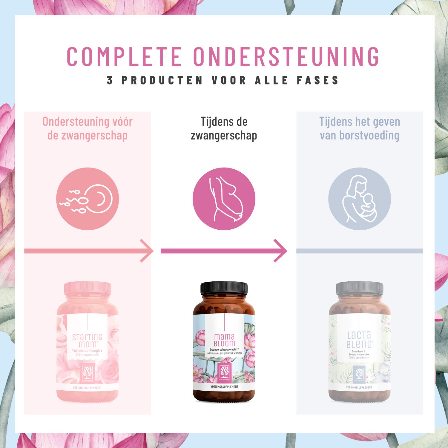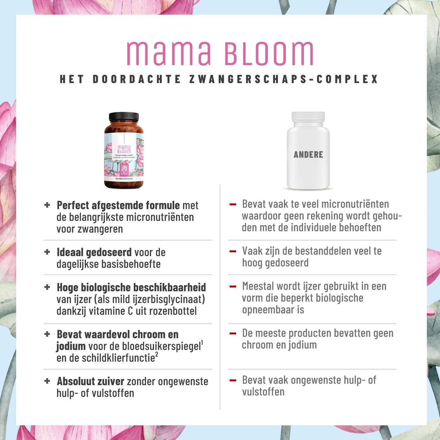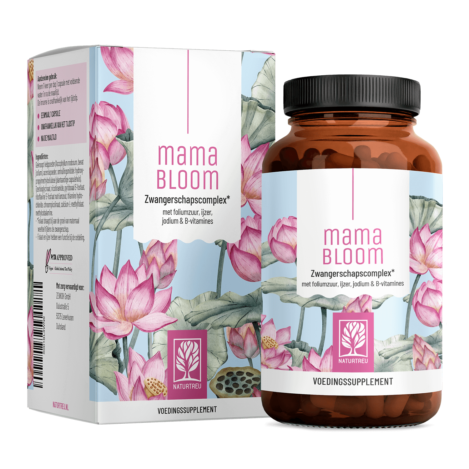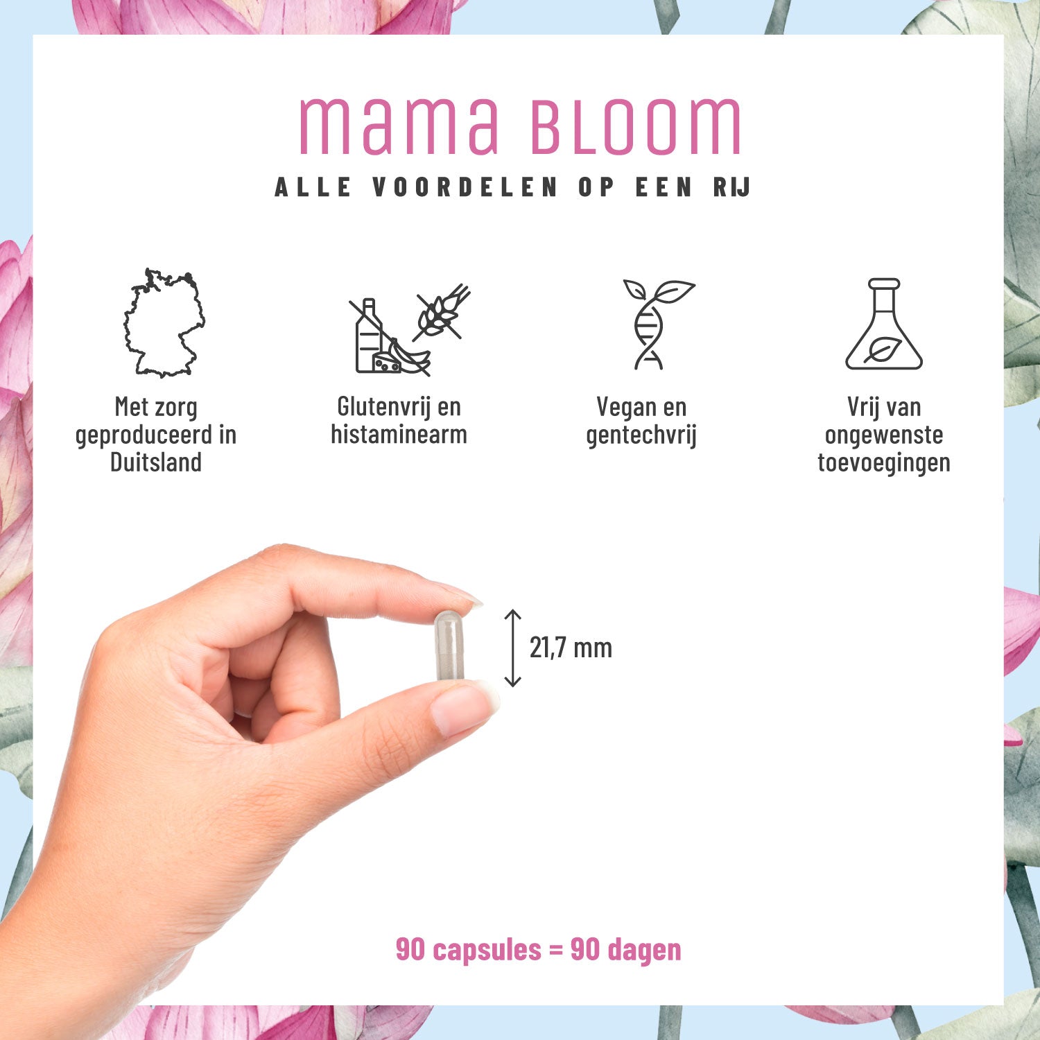 MAMA BLOOM is een doordachte samenstelling voor zwangere vrouwen die zorgvuldig geselecteerde micronutriënten bevat. Daaronder ook de drie essentiële stoffen die de Duitse Vereniging voor Voeding (DGE) aanbeveelt: foliumzuur, jodium en ijzer. Naast deze essentiële micronutriënten bevat MAMA BLOOM nog andere belangrijke vitaminen en mineralen. Zo krijgen jij en je baby alle voedingsstoffen die jullie nodig hebben.